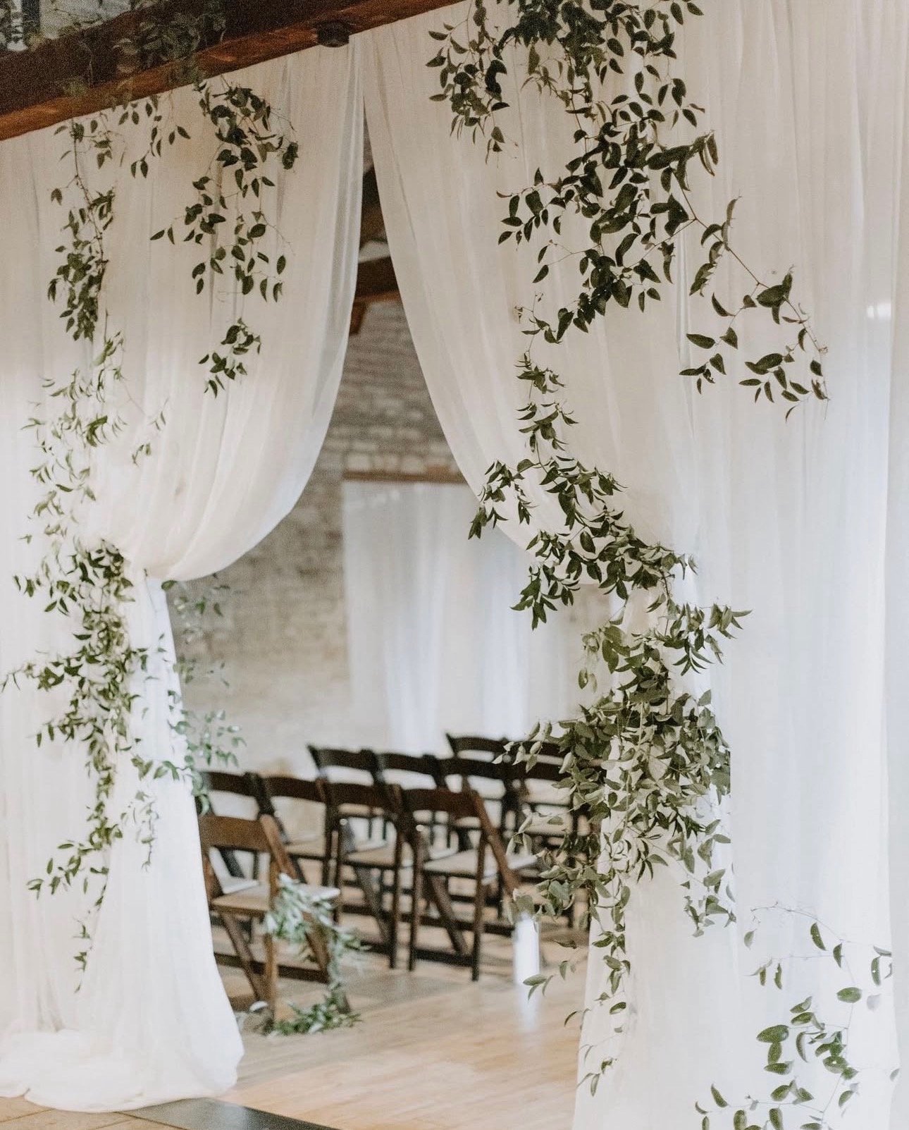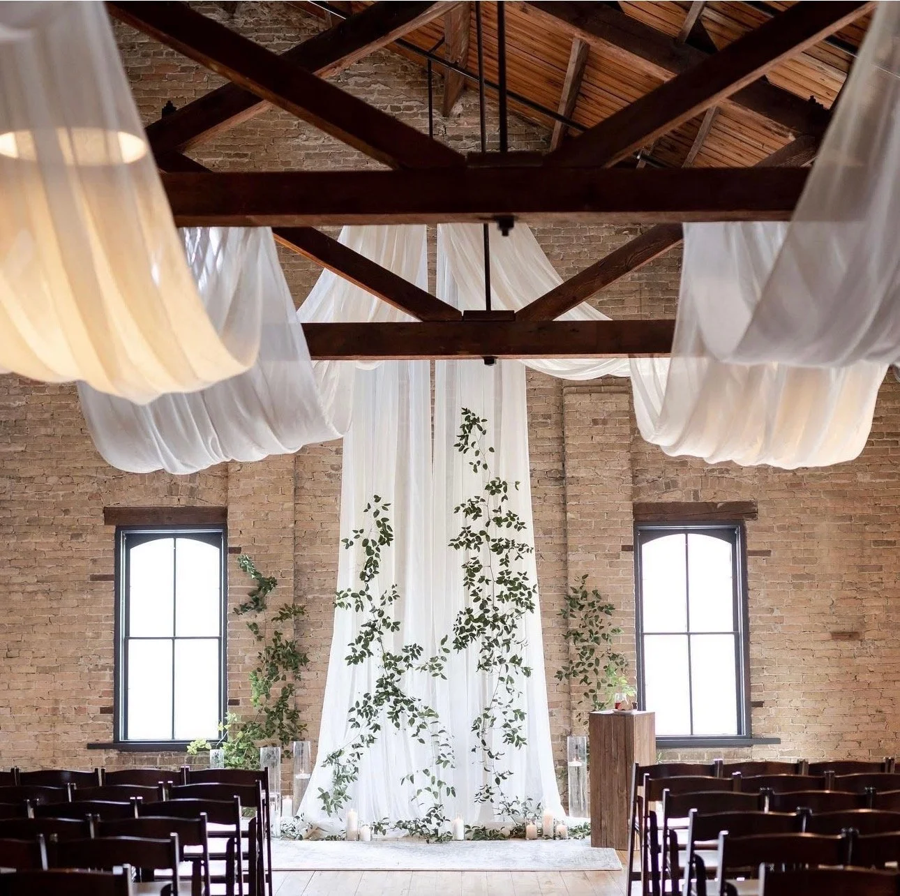 Imagine exchanging vows beneath cascading fabric and greenery, with candlelight flickering and sunlight pouring through the tall windows.